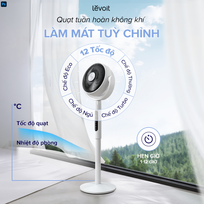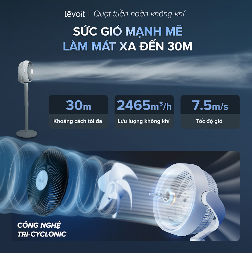 Hôm nay (24/03/2026) - Levoit chính thức ra mắt quạt tuần hoàn không khí Levoit 22.9 cm. Với công nghệ Tri-Cyclonic, quạt có thể đẩy gió xa đến 30m và lưu thông không khí cho mọi không gian. Sản phẩm được trang bị tính năng xoay đa chiều (90° ngang, 120° dọc), cùng 12 tốc độ và 4 chế độ vận hành linh hoạt. Quạt tuần hoàn không khí Levoit 22.9 cm còn tích hợp cảm biến nhiệt độ và chế độ Eco, giúp tự động điều chỉnh tốc độ gió theo nhiệt độ môi trường.